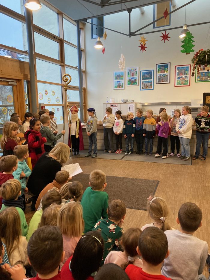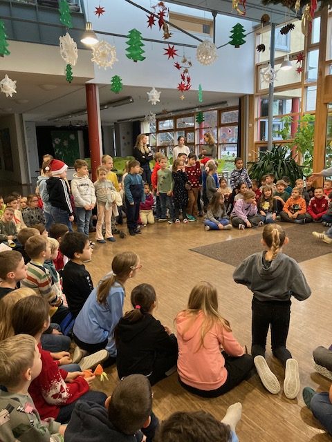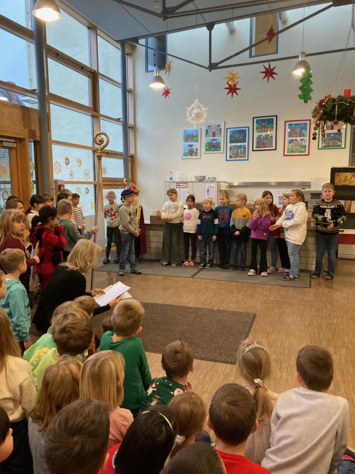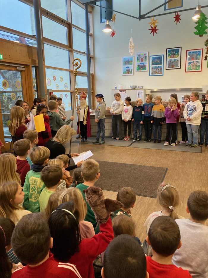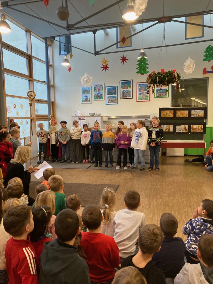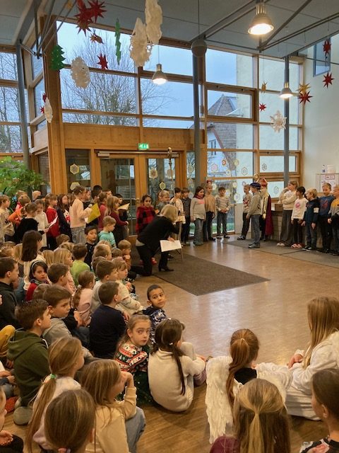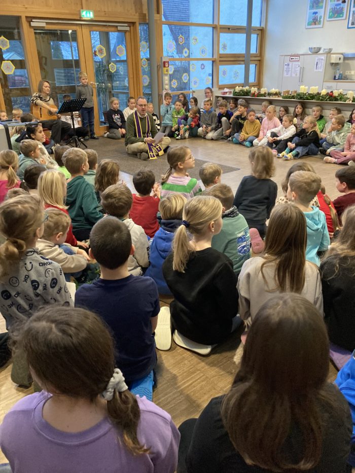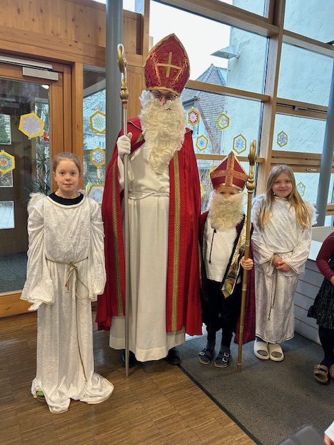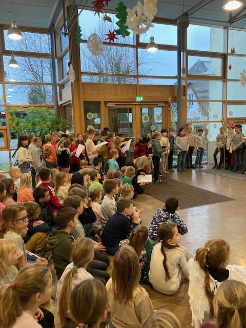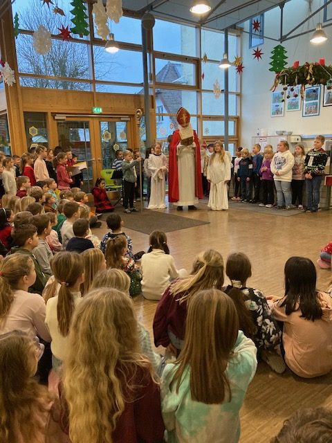 Die Grundschule Schöllnach feierte auch in diesem Jahr im Dezember jeden Montag nach den Adventssonntagen die Ankunft unseres Herrn Jesus Christus in der Aula. Am ersten Montag segnete unser Pfarrer Herr Dr. Haider die Adventskränze für die Klassenzimmer der Kinder. Jede Klassenstufe hatte für die jeweilige Morgenfeier etwas Besonderes vorbereitet. Die Klasse 1a führte einen lustigen Tanz auf und die Klasse 4b spielte ein kleines Theater: Rudolph the rednosed reindeer, ein soziales Stück bei dem man lernen soll, jeden so anzunehmen wie er ist. Zu jeder Feier sangen wir das Lied: Dicke rote Kerzen, Tannenzweigenduft und ein Hauch von Heimlichkeiten liegt jetzt in der Luft. Am 05.12.2025 kam auch der Nikolaus an unsere Schule. Er wurde begleitet von zwei Engeln aus der 4. Klasse. Die 2. Klassen gestalteten für diesen Tag das Programm mit einem Singspiel. Unser sehr engagierter Elternbeirat unterstützte wieder den Nikolaus bei der Organisation der Geschenke für alle Kinder. Herzlichen Dank dafür! Am letzten Tag vor den Weihnachtsferien fand in der Pfarrkirche ein Adventsgottesdienst für unsere Schule statt. Fleißig hatten die Kinder alle Lieder gemeinsam mit der Musikschule Fröhlich einstudiert. Nach dem Gottesdienst gab es Punsch für die Eltern und Kinderpunsch für alle Klassen vom Elternbeirat. Auch dafür herzlichen Dank!